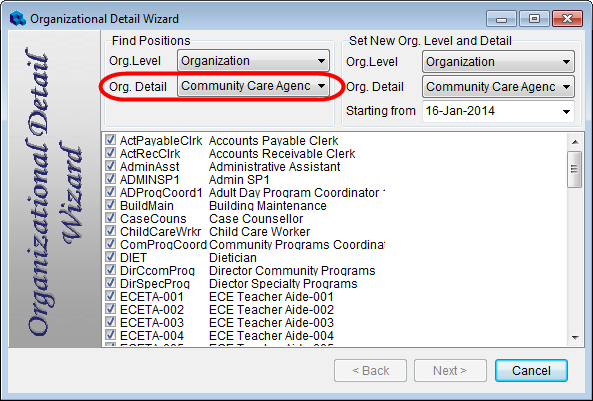 This should be an Organization or Facility level so that all of the positions that have been configured for the organization are listed in the lower pane.