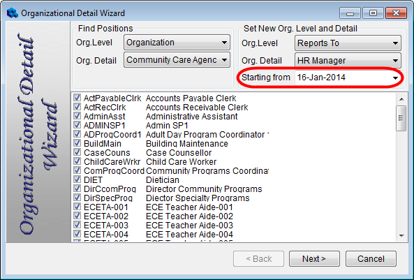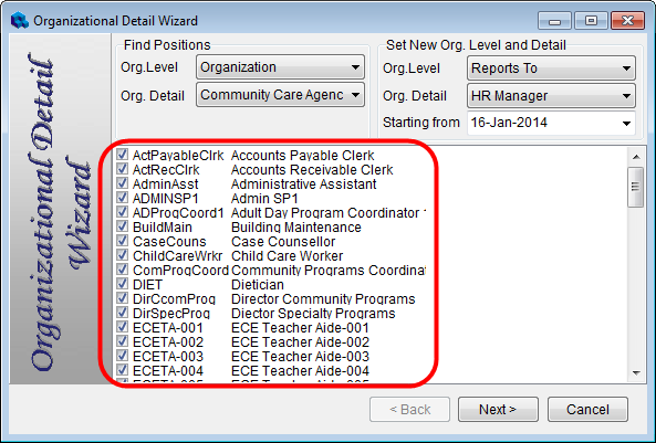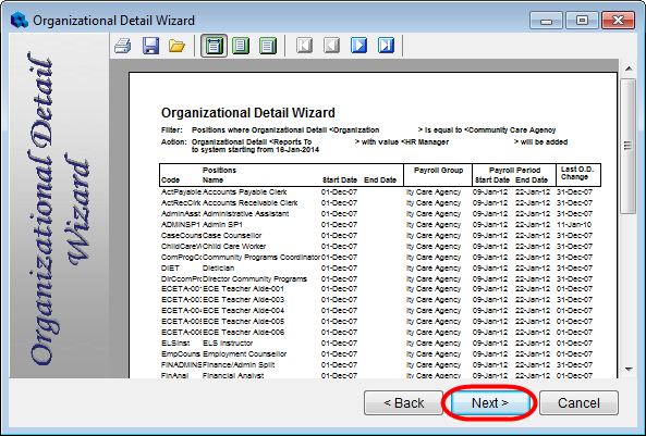 A report appears, showing you all of the positions that have been attached to the manager. Click Next.