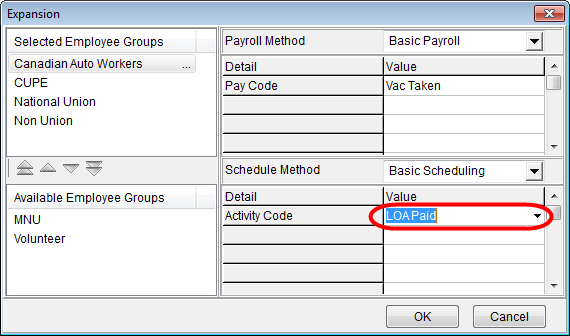 Leave expansion determines how leave will impact scheduling and timecards. The Expansion tab enables you to specify, at the employee group level, which pay code and absence shift activity will be applied to a leave type. Methods are used to control pay code/shift activity assignment. You only need to set up a payroll method if you use Quadrant to generate timecards, and a scheduling method if you use the Quadrant Scheduling module. Timecards for an approved leave are created in the pay period in which the leave occurs.