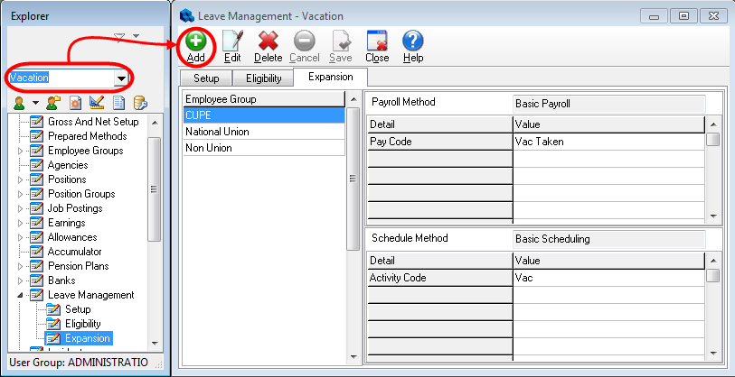 - Select a leave type from the list box on the Explorer, and then click Add to open the Expansion dialog.