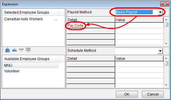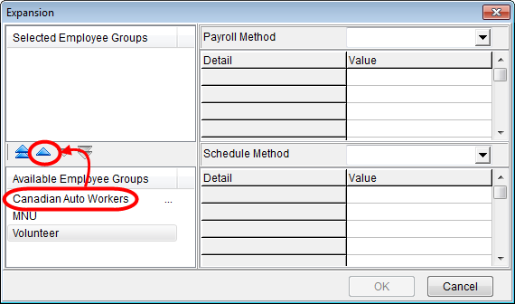 - Select the employee groups that you want to apply the payroll method to in the Available Employee Groups pane, and use the blue arrows to move them into the Selected Employee Groups pane.