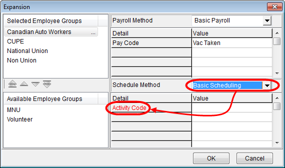 Note! When a shift type is configured in the Shift Setup window, activities are associated with the shift. These are the same activity codes that are associated with Schedule Methods on the Expansion dialog.