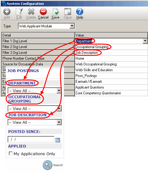 After you've created an Org Level for Occupational Groups and UDFs for recruiting, you need to select them on the System Configuration window of the Administration menu so they are available in Quadrant Self Service.